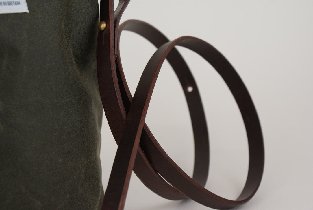 Main bag is made from waxed cotton, made in Scotland. This waxed cotton has a high patina on handling which will allow the bag to mellow beautifully with age. The recipe used in this finish utilises up to 20% of waxes obtained by thermally breaking waste plastics to yield wax and oil. The beauty of waxed cotton is its durability and longevity — it is built to last. The densely woven cotton is strong and reliable and unlike many alternatives, can be maintained.